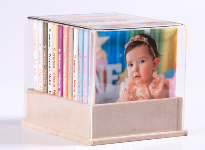 Álbum mensal 15x15 com porta acrílico.